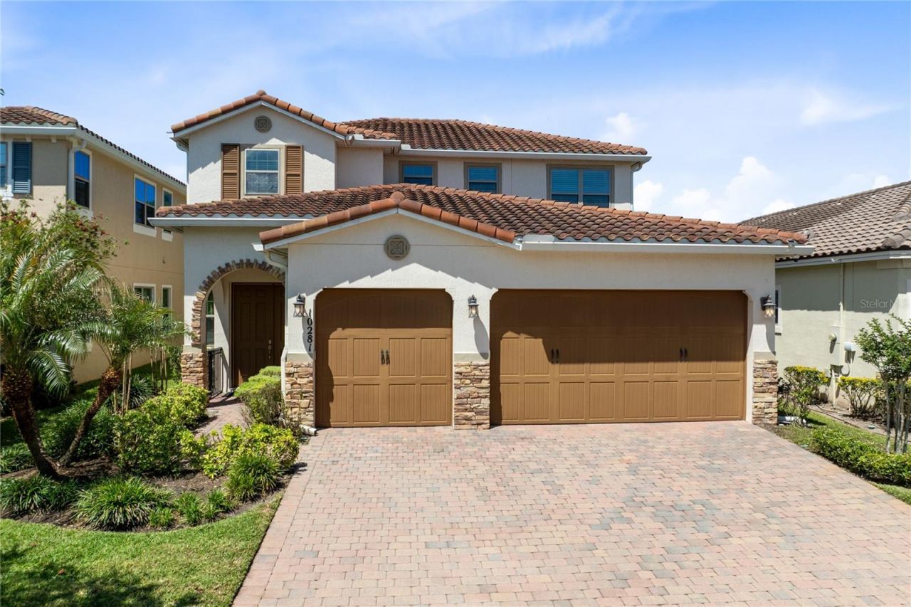 Built in 2018 inside the gates of Eagle Creek, this 4-bedroom, 3.5-bath Spanish Mediterranean home spans 2,873 square feet across two floors and a 3-car garage. The main level holds the primary suite and three separate living spaces. The second floor holds three bedrooms, a dedicated office, and a bonus room.Wood-look plank tile runs the length of the main floor without a break. A formal great room and dining space sit at the front under an iron-balustered staircase. The kitchen takes the middle: granite island, dark espresso cabinetry stacked to the ceiling, glass-mosaic backsplash, stainless appliances under a chimney hood, and a bay-window breakfast nook for morning coffee. The family room sits at the back, with sliders to the covered patio and a clear sightline from the kitchen island all the way to the yard.The primary suite is the floor plan's signature. The bedroom runs nearly 27 feet under a tray ceiling and opens directly to the covered patio through its own slider. The bathroom is laid out for two: dual vanities flanking a makeup station, glass rain shower, corner garden tub set under a window, and a private water closet. Two walk-in closets share the wall with the bath.Upstairs answers the rest of the program. A dedicated office at the top of the stairs. Three bedrooms, two of them sharing a Jack and Jill bath. And a bonus room over 21 feet long, already wired with in-ceiling speakers and currently set up for movie nights.Outside, a covered patio runs the full back wall under a deep overhang built for Florida afternoons. Two sliders reach it, one from the family room and one from the primary, so the social and private sides of the house each get their own way out. The fenced yard backs to a tree-buffered green corridor instead of another rooftop, which is rarer in this part of Eagle Creek than the lot description suggests.Behind the gates: clubhouse, resort-style pool, tennis, fitness, and a championship golf course. Beyond them: Lake Nona Town Center, Medical City, and OIA, all a short drive away. And inside this particular front door: the one floor plan in the neighborhood that lets you stay on the main floor for everything you actually need, and head upstairs only when you want to.