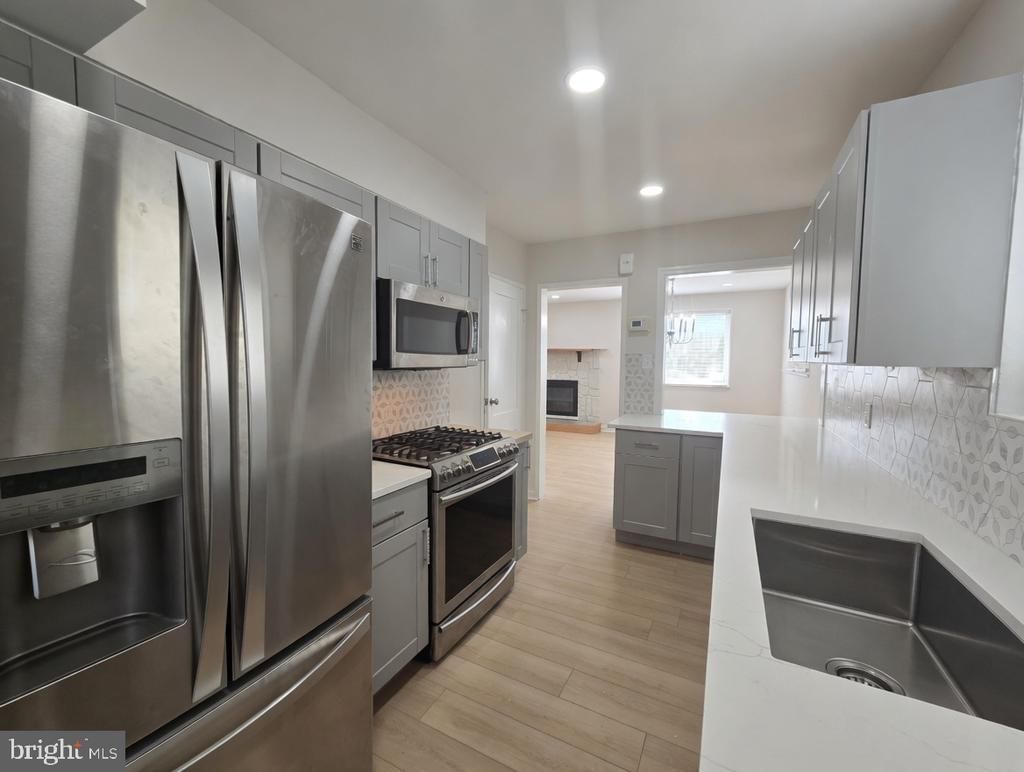 Completely renovated 5-bedroom, 2.5-bath single-family home in Franklin Knolls, Silver Spring. Thoughtfully updated from top to bottom with designer finishes throughout. The open-concept main level features new luxury vinyl plank flooring, a striking stone fireplace with rustic wood mantel, recessed lighting, and a chandelier-lit dining area. The fully renovated kitchen showcases Calacatta quartz countertops, custom gray shaker cabinetry, a geometric porcelain tile backsplash, and a complete stainless steel appliance suite including a gas range, French door refrigerator, built-in microwave, and dishwasher. Three main-level bedrooms each include ceiling fans and closet storage. The spa-quality full bath offers floor-to-ceiling marble-look porcelain tile, a deep soaking tub, rain showerhead, and built-in niche shelf. A modern powder room completes the main level. The fully finished basement adds a large rec room with designer board-and-batten wainscoting, two additional bedrooms, a full bath with walk-in shower, laundry area, and a private separate exterior entry. Step outside to a generous deck overlooking a fully fenced yard with mature tree canopy and a storage shed. Covered carport with extended private driveway. Minutes to I-495!