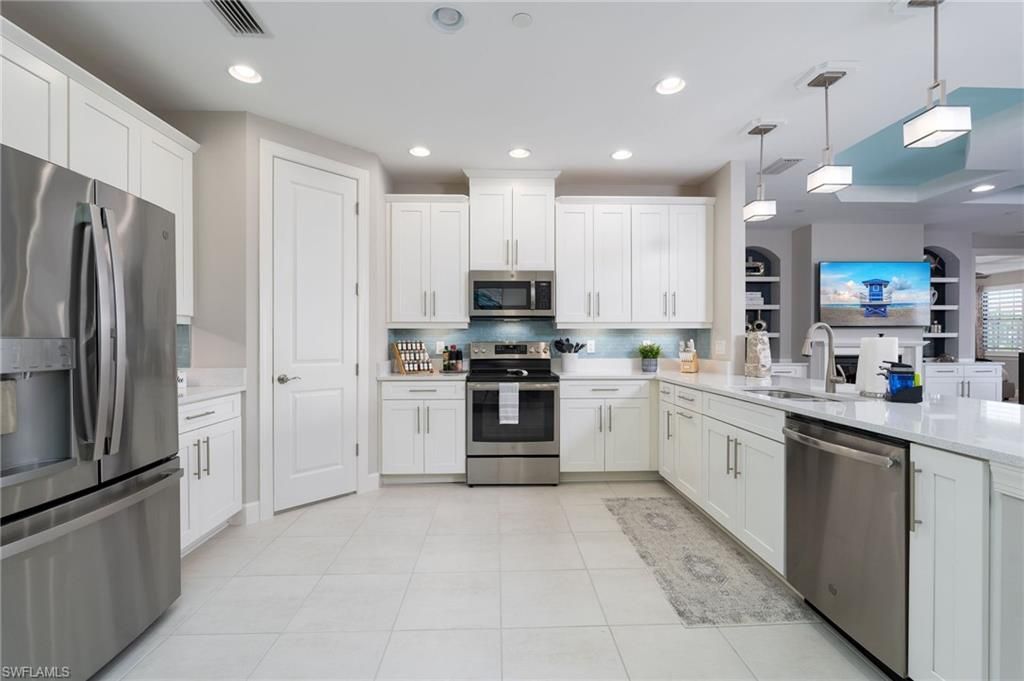 Welcome to your slice of paradise in Naples! This beautifully decorated first-floor coach home is located in the highly sought-after resort-style community of Esplanade Golf & Country Club and is offered completely turn-key—just bring your suitcase and start enjoying the Naples lifestyle. This luxurious 2-bedroom, 2 full bath residence with a 1-car attached garage features a spacious and inviting open-concept great room floor plan. Thoughtfully upgraded throughout, the great room showcases tray ceilings, custom built-in cabinetry and shelving, upgraded lighting, remote-controlled window coverings, plantation shutters, and ceiling fans. The home also features custom closets for optimal organization and storage. Enjoy breathtaking western exposure from your oversized screened lanai—perfect for taking in the stunning Naples sunsets. The lanai overlooks a tranquil pond with picturesque golf course views just beyond, offering a serene and private outdoor retreat. Storm Smart shutters provide added protection and peace of mind. This property includes a Social Membership, granting access to the exceptional amenities. Residents enjoy a resort-style pool with cabanas and a poolside Bahama Bar, tennis and pickleball courts, bocce, a full-service spa, fitness center, dog park, and 14 miles of scenic trails. The community also features an 18-hole private golf course with limited year-round play opportunities. On-site dining includes a restaurant, bar, wine tasting room, and café. Exciting enhancements are coming soon in 2026, including a fully renovated and expanded poolside Bahama Bar, a new outdoor bar at the Barrel House, expanded golf practice facilities, and a state-of-the-art air-conditioned indoor pickleball complex with four courts. For added value, the special assessment has been PAID IN FULL!! This is a rare opportunity to own a beautifully upgraded, move-in-ready coach home in one of Naples’ premier communities.